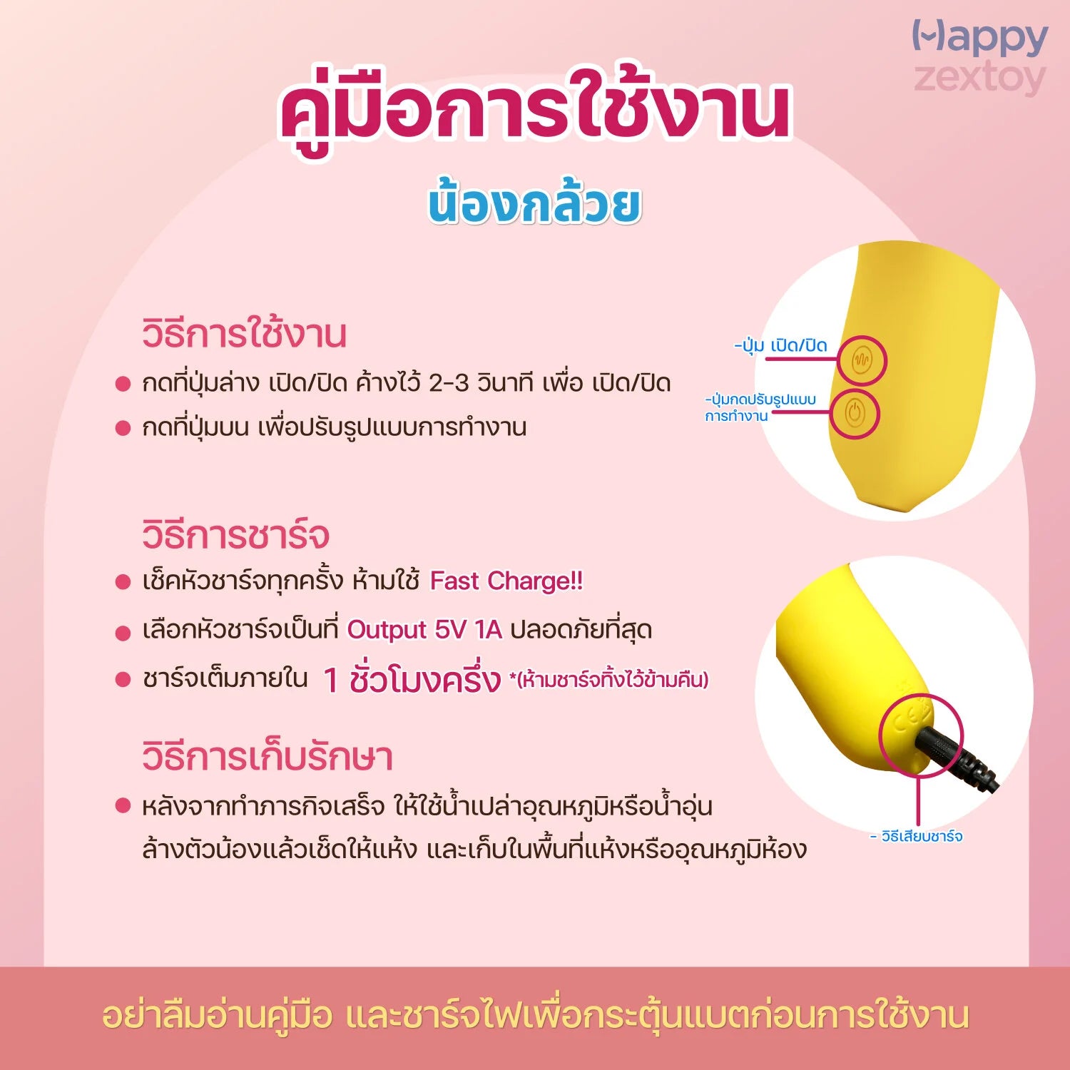 การทำความสะอาดก่อน/หลังการใช้งาน : ทำความสะอาดด้วยเจลอาบน้ำเด็ก หรือน้ำยาทำความสะอาดจุดซ่อนเร้น ด้วยน้ำเปล่าอุณหภูมิปกติหรือน้ำอุ่น เช็ดทำความสะอาดให้แห้งทุกครั้ง หลังการใช้งาน เพื่อยืดอายุการใช้งาน