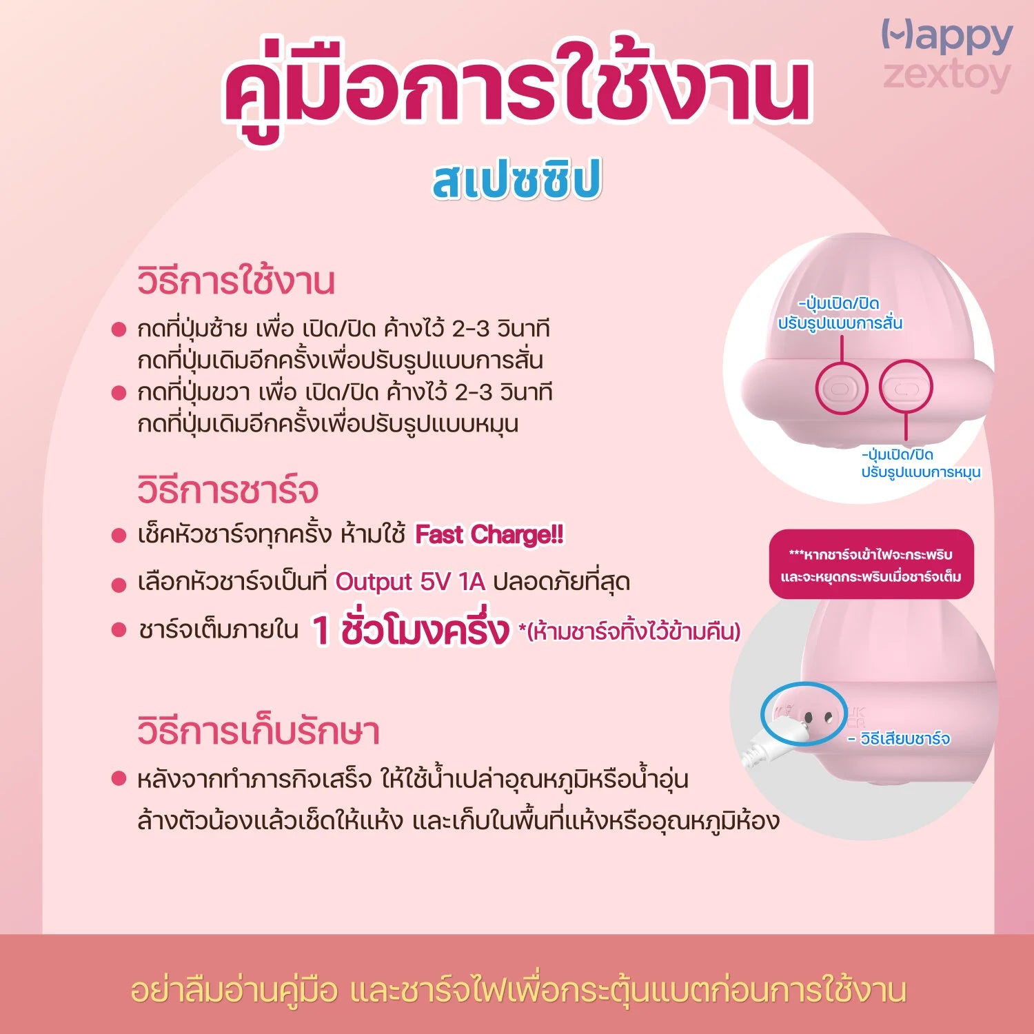 การทำความสะอาดก่อน/หลังการใช้งาน  ทำความสะอาดด้วยน้ำเปล่าอุณหภูมิปกติหรือน้ำอุ่น เซ็ดทำความสะอาดให้แห้งหลังการใช้งาน เพื่อยืดอายุการใช้งาน